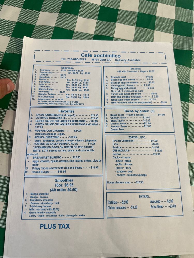 Welcome to Cafe Xochimilco, your go-to destination for an authentic Mexican breakfast and brunch experience in the heart of Long Island City, NY. Our menu showcases a delightful array of traditional dishes that burst with flavor and freshness. Guests rave about our Huevos con Salsa Verde, a perfect start to your morning, alongside mouthwatering options like Nachos Al Pastor and hearty burritos, all complemented by excellent service.